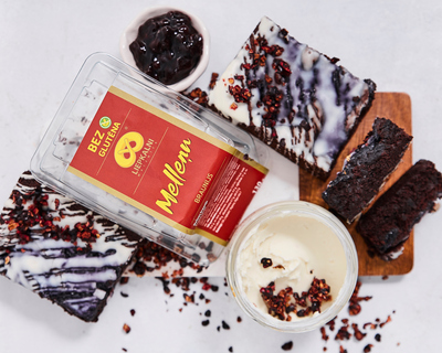 Sastāvdaļas: bezglutēna brauniju maisījums (cukurs, kakao pulveris, kartupeļu ciete, palmu eļļa, sūkalu pulveris, dekstroze, olu baltuma pulveris, irdinātāji E450, dzeramā soda, emulgators E471, sāls, biezinātājs E415), meža melleņu pildījums (36%)(meža mellenes, glikozes – fruktozes sīrups, pārveidota ciete, skābuma regulētājs E331iii, dabīgs aromatizētājs), šokolādes krēms (cukurs, palmu tauki, rapšu eļļa, vājpiena pulveris, glikozes sīrups, kakao sviests, emulgatori E472a, saulespuķu lecitīns, aromatizētājs), rapšu eļļa, olas, upeņu gabaliņi (saldējot žāvēti)