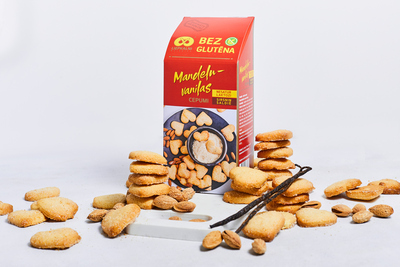 Sastāvdaļas: bezglutēna miltu maisījums (bezglutēna kviešu ciete, lupīnu milti, kukurūzas ciete, linsēklu milti, biezinātājs guāra milti, cukurs, emulgators saulespuķu lecitīns, cepamais pulveris (irdinātāji E450, dzeramā soda), sāls), cukurs, augu tauku maisījums (augu eļļas (kokosriekstu, rapšu), ūdens), olas, mandeļu milti (5%), vaniļas cukurs (1%)(cukurs, pūdercukurs, vaniļa, kartupeļu ciete, aromatizētājs), biezinātājs ksantāna sveķi, rozmarīna ekstrakts