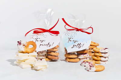 Kliņģerīši ar balto šokolādi ar pievienotu vēlējumu Tu esi prieks!, Tu esi zelts!, Tev piestāv starot!, No sirds!