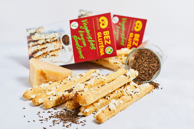 Sastāvdaļas: bezglutēna miltu maisījums (bezglutēna kviešu ciete, lupīnu milti, kukurūzas ciete, linsēklu milti, biezinātājs guāra milti, cukurs, emulgators saulespuķu lecitīns, cepamais pulveris (irdinātāji E450, dzeramā soda), sāls), margarīns (palmu tauki, rapšu eļļa, emulgatori E471, saulespuķu lecitīns, sāls, skābuma regulētājs citronskābe, dabīgs aromatizētājs, krāsviela beta karotīns), vegānu siers (19 %)(kokosa tauki, pārveidota kartupeļu ciete, aromatizētājs vegānu, B12 vitamīns), ķimenes (1.8 %), augu tauku maisījums (augu eļļas (kokosriekstu, rapšu), ūdens), sāls, linsēklu milti, skābuma regulētājs citronskābe