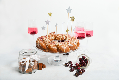 Jubilejas kliņģeris ar ķiršu, karameļu un biezpiena pildījumu pīnēs. Garnēts ar karameļu glazūru un šokolādes stīdziņām.