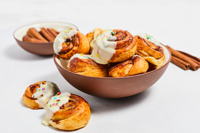 Mazas rauga mīklas maizītes, veidotas gliemezīša formā, pildījumā kanēlis ar cukuru, mērcētas baltā šokolādē, piešķirot jaunu garšas nianses.