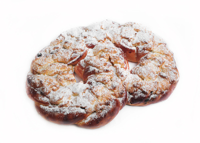 Ar bagātīgu rozīņu pildījumu un dekorēts ar biezām drumstalām. Veidots kliņģeru formā.