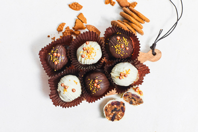 "Kartupelī" piparkūkas, dzērvenes, rieksti, plūmes, maskarpone siera krēms. Apviļāta baltā vai brūnā šokolādes glazūrā, pievienoti svētku dekoriņi.