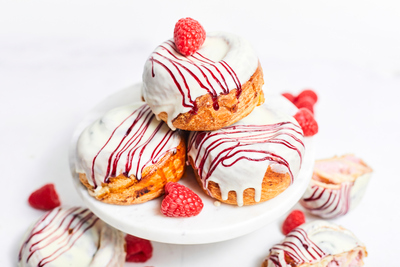 Maigais biezpiena un sulīgs aveņu pildījums saplūst vienā harmoniskā garšā, kas raisa apbrīnu un svētku sajūtu. Virsma rotāta ar elegantu gaišās šokolādes pārklājumu ar košām aveņu glazūras stīdziņām, kas piešķir maizītei svētku noskaņu un ļauj maizītes baudītājam justies kā svētkos.