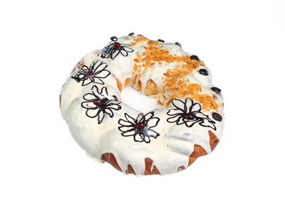 Pārklāts ar balto šokolādi, kanēli, pildījumā biezpiens, kanēlis.