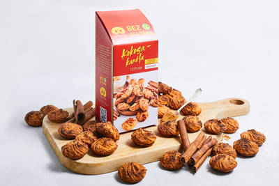 Состав: смесь муки без глютена ( пшеничный крахмал без глютена, люпиновая мука, кукурузный крахмал, льняная мука, гуаровая камедь, сахар, эмульгатор лецитин подсолнечный, разрыхлитель (рыхлители Е450, пищевая сода), соль), масло, сахар, яйца, кокосовая мука 7%,сахарный сироп, корица (0.9%), ксантановая камедь, екстракт розмарина.