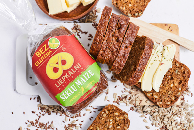 Состав: смесь семян для выпечки хлеба (53%) (безглютеновый пшеничный крахмал, семена подсолнуха, льняное семя, закваска, семена тыквы, льниная мука, сахар, йодированная соль, карамель ( сироп глюкозы, сахар),