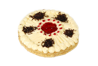 Светлый бисквит с заварным кремом и начинкой из свежей малины, украшен кремом.